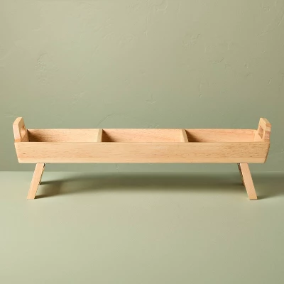 Serve a variety of items in one go with the Foldable Wood Serving Tray from Hearth & Hand™ with Magnolia. This brown serving tray comes with multiple divided compartments to give you ample space for your snacks, cheese and other items. Made of wood, this rectangle tray has folding legs for added convenience. Plus, it comes with side cut-out handles for convenient serving.