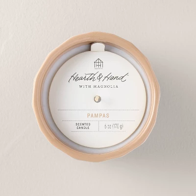 Add decorative appeal to your space while spreading a woodsy aroma with the Speckle-Faceted Ceramic Pampas Jar Candle from Hearth & Hand™ with Magnolia. This white and brown jar candle features a round shape with a speckled, faceted design for a beautiful look. The scented jar candle has a mix of violet, amber and woodsy scents to help spread a refreshing ambience. Made of ceramic and filled with palm and paraffin wax, this faceted jar candle burns for around 20 hours.